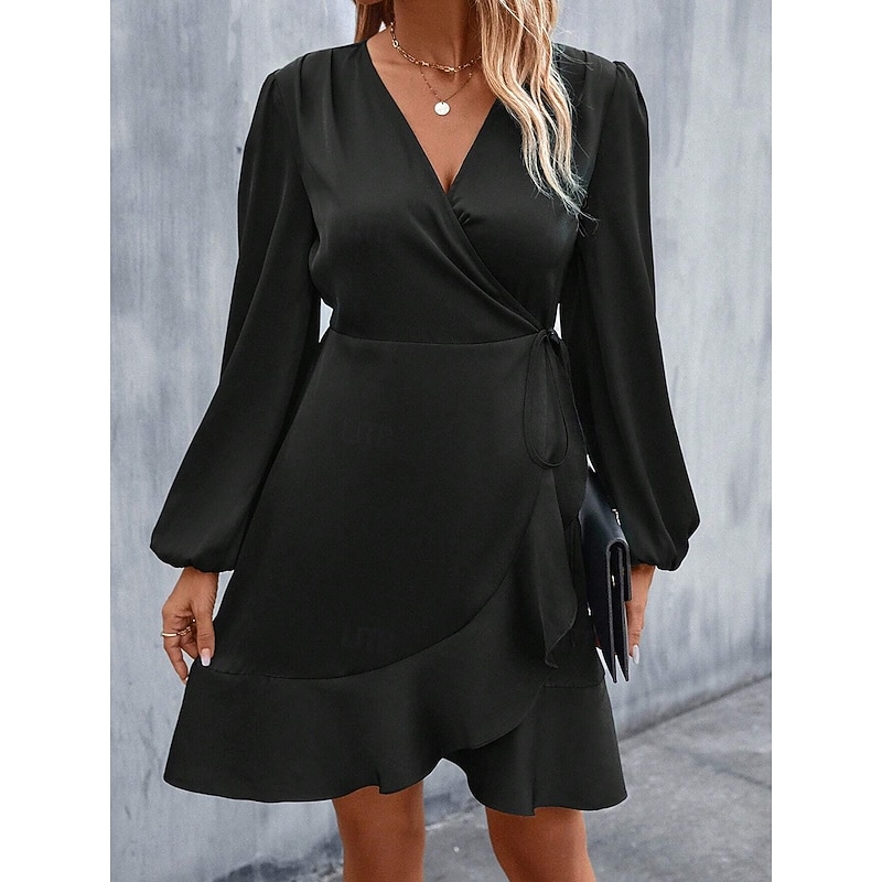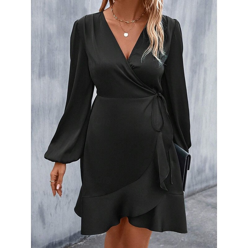 Highlights [Fabric]: Crafted from a smooth and high-quality polyester blend, this dress offers a luxurious sheen and softness, providing both comfort and style. It drapes beautifully over the body, creating a flattering silhouette. [Fit]: The dress features a regular fit, with a classic wrap style that includes a tie at the waist for an adjustable fit. This ensures comfort while accentuating the feminine figure. [Design Highlights]: The elegant V-neckline and long sleeves add sophistication, while ruffle and patchwork details enhance the overall aesthetic. Its mini length and plain pattern make it a versatile addition to any wardrobe. [Occasions]: Suitable for a range of events, this dress can transition seamlessly from casual outings to more formal gatherings, making it perfect for vacations or parties in fall and winter. [Size]: Available in a broad size range from S to 2XL, ensuring a good fit for a variety of body types. Offered in black, pink, and blue colors, the dress caters to diverse style preferences.
