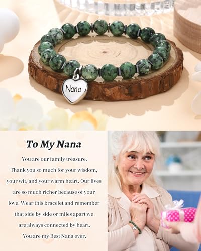 • Nana Gifts for Birthday:The natural stone Nana bracelet is crafted from African natural turquoise,with a polished stainless steel heart pendant engraved with "you're awesome".Comfortable for all-day wear—no rust,no allergies,shiny,sturdy,enduring like your bond through time