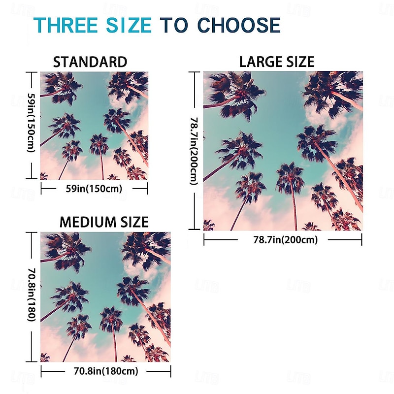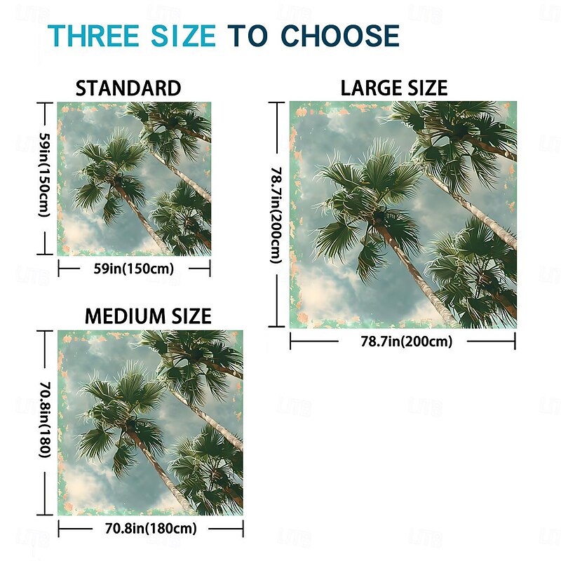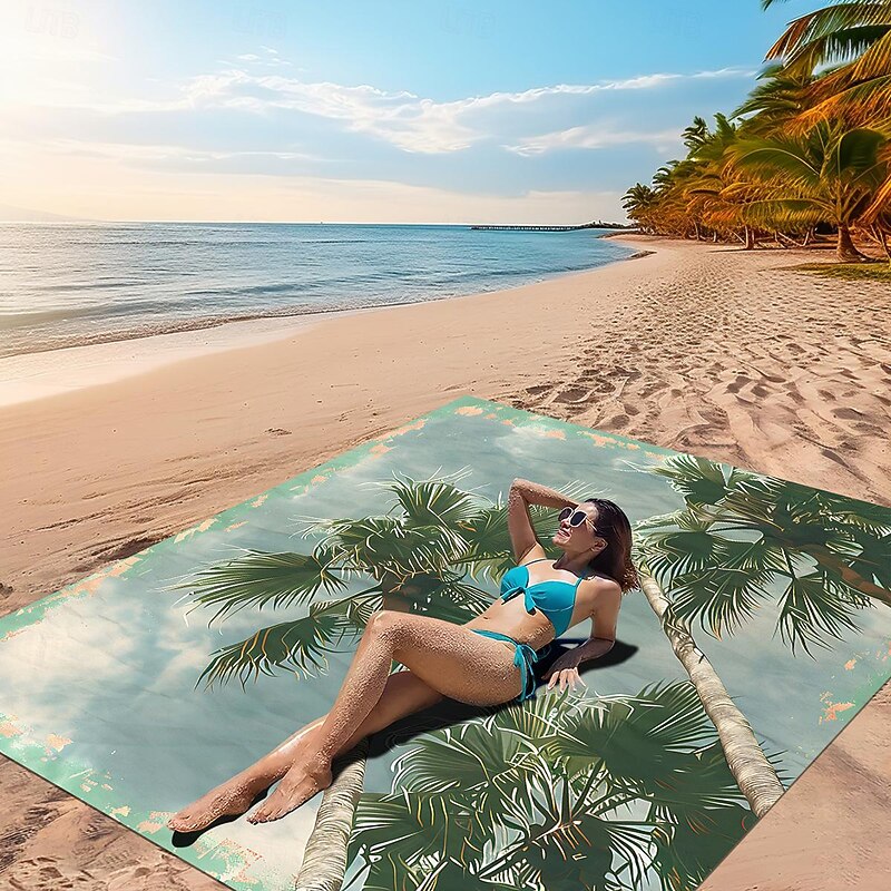 Highlights [Fabric] Crafted from premium polyester, this beach towel ensures durability and a soft touch against the skin. The material excels in quick-drying properties, making it an ideal choice for beach outings, poolside relaxation, or any water-related activity. [Design Highlights] Featuring a vibrant tropical print, this towel beautifully showcases green palm trees against a serene blue background, infusing a sense of exotic elegance into your leisure time. The eye-catching design makes it a standout accessory for any sunny day. [Shape] This towel comes in a generous 150cm by 150cm square shape, providing ample space for sunbathing, lounging, or even picnicking at the beach or pool. Its large, square design adds versatility and practical appeal, ensuring you have plenty of room to relax. [Occasions] Perfect for spring and summer, this towel is designed to complement a variety of outdoor settings, from beach getaways and pool parties to casual picnics in the park. Its stylish appearance and functional features make it suitable for any leisure scene. [Size Suggestions] Available in a versatile size of 150cm by 150cm, this towel caters to a wide range of uses, providing adequate space for individual comfort or sharing with a partner, accommodating various relaxation activities with ease.