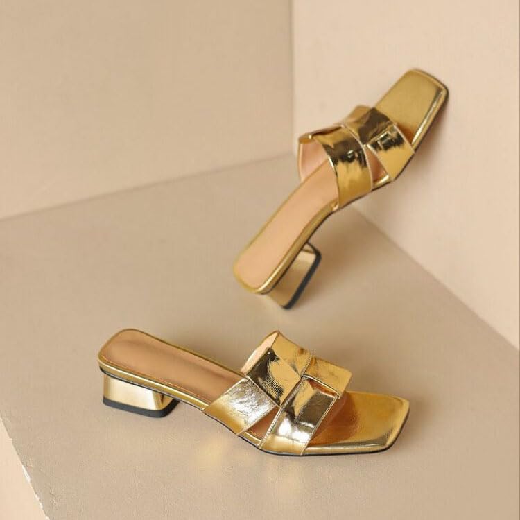 Women'S Patent Leather Braid Chunky Heeled Summer Slides Sandals, Simple Fashionable Square Open Toe Low Block Heel Dress Sandals, gentle Beach Walking Party Slippers