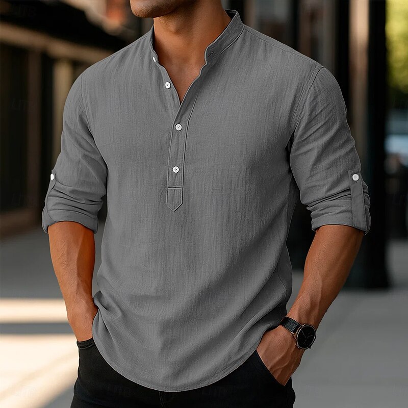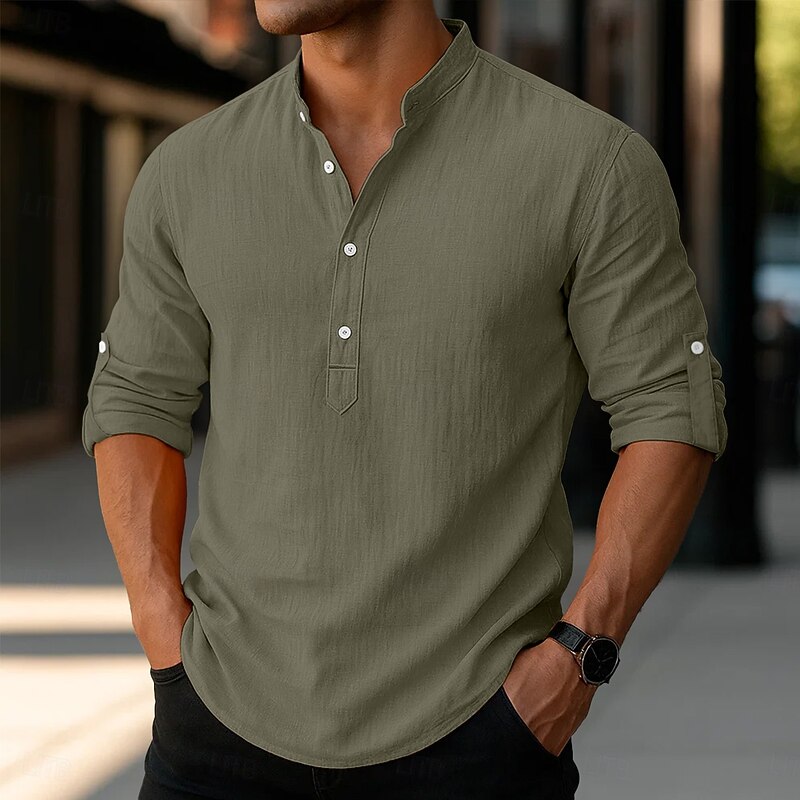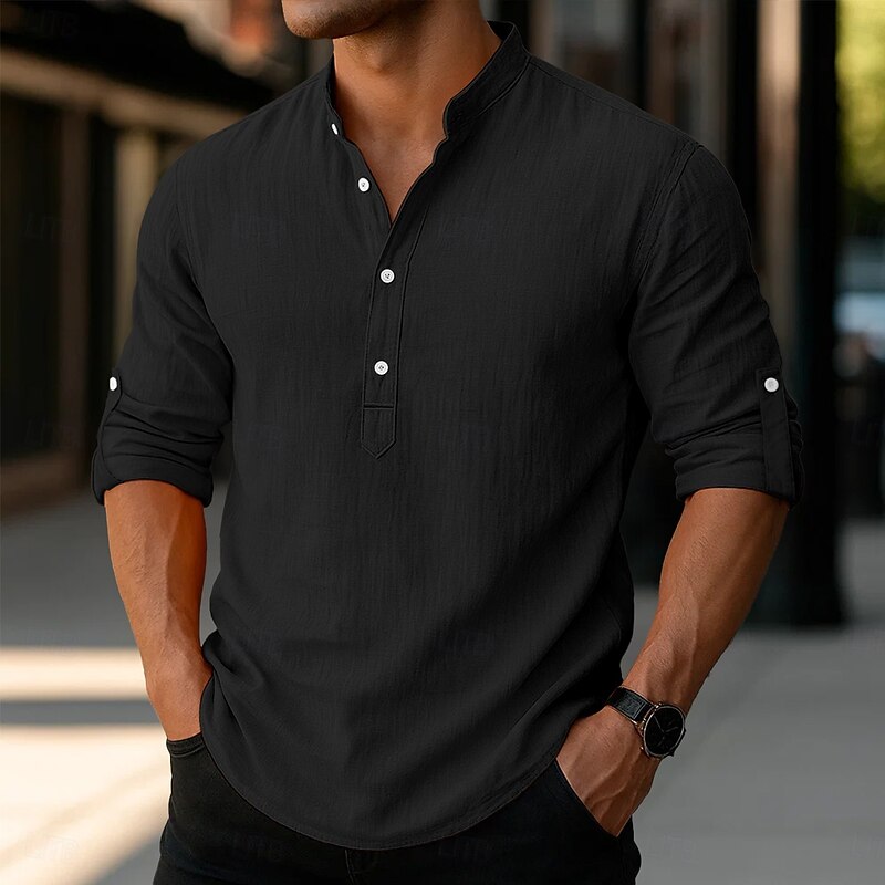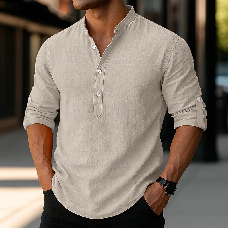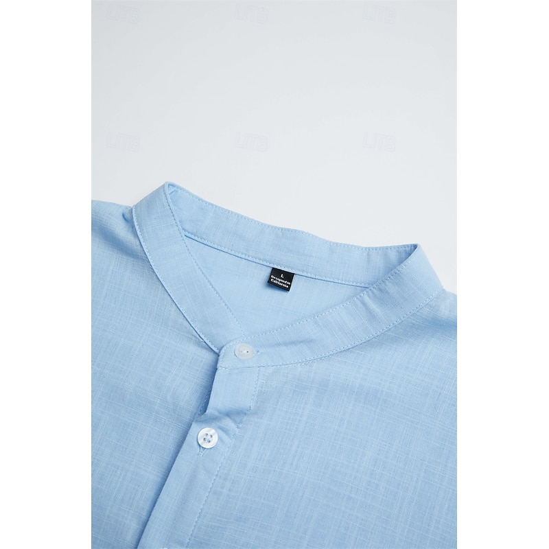 More information about Men's Linen Shirt Popover Shirt Casual Shirt Beach Shirt Band Collar Shirt Plain Vacation Hawaiian Black White Pink Orange Long Sleeve Henley Spring & Summer Clothing Apparel Roll up Sleeves