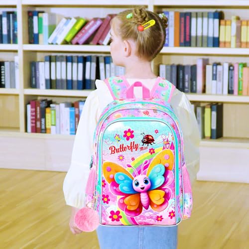 AGSDON 3PCS Girls Butterfly Backpack, 16" Kids Backpacks and Lunch Bag Set for Girls, Water Resistant Elementary Bookbag for Toddler 6