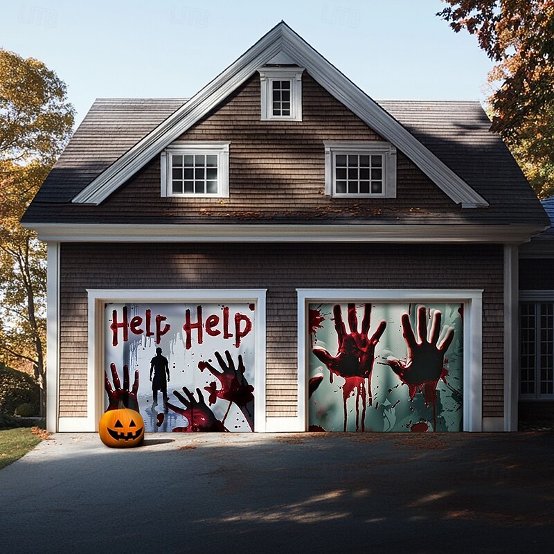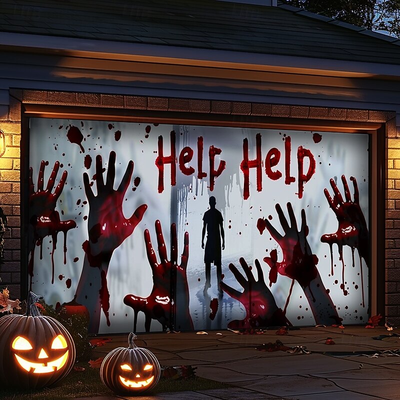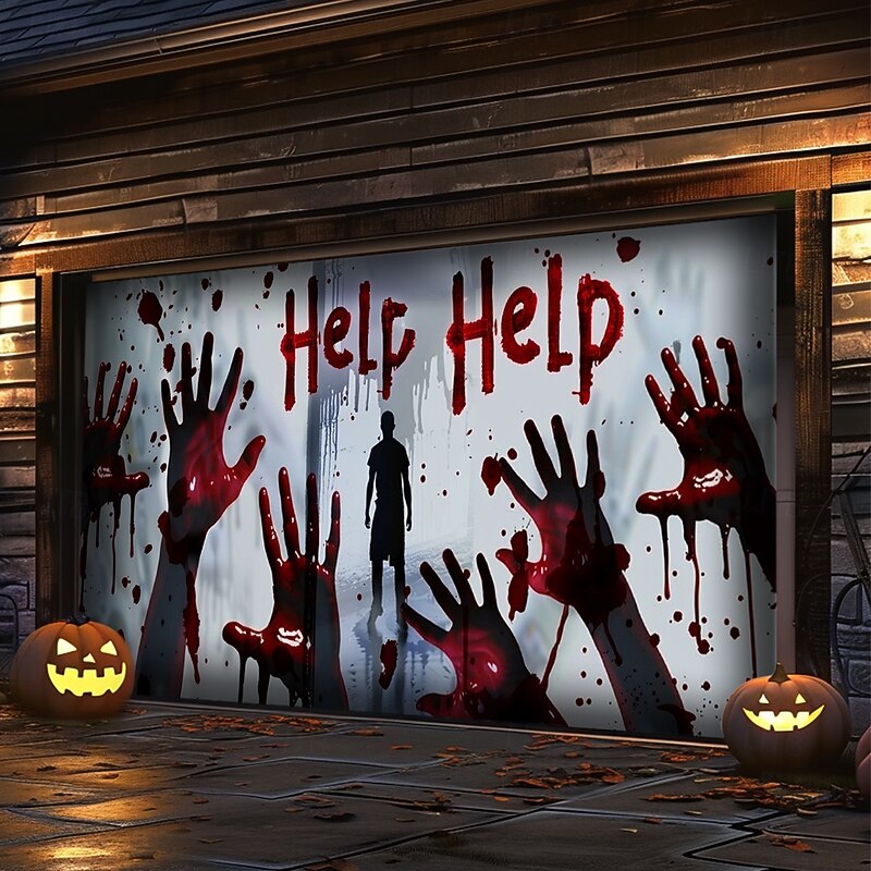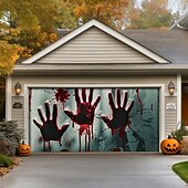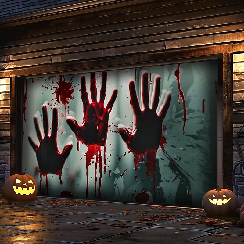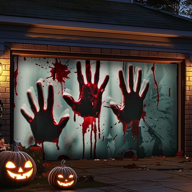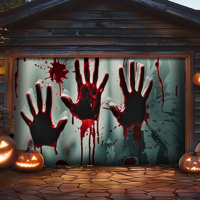 Highlights Create a spine-chilling Halloween display with our Bloody Hands Outdoor Garage Door Cover Banner . Featuring a terrifying castle scene with eerie bloody handprints, this large backdrop decoration is perfect for transforming your garage door or home wall into a haunted attraction. Key Features: Chilling Bloody Hands Design : The banner displays a horrifying castle scene adorned with unsettling bloody handprints, adding a gruesome touch to your Halloween decorations. Generous Coverage : Sized to fit most garage doors or large wall surfaces, this banner provides an impactful and spooky backdrop for your Halloween festivities. Durable and Weather-Resistant : Crafted from high-quality, soft material, this cover is built to endure the elements and maintain its creepy allure throughout the Halloween season. Easy Installation : Features grommets for straightforward hanging, making setup and removal quick and hassle-free. Versatile Decoration : Ideal for outdoor use, this banner is perfect for decorating garages, walls, or any expansive surface to create a terrifying Halloween atmosphere. Long-Lasting Quality : Designed for durability, this banner will withstand multiple seasons of use, ensuring it remains a haunting highlight of your Halloween decor. Turn your home into a scene of fright with the Bloody Hands Outdoor Garage Door Cover Banner and give your Halloween display a fearsome and unforgettable touch.