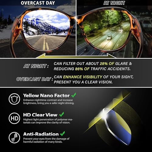 • HD NIGHT VISION LENS: Anti-glare night driving glasses are made polarized yellow-tinted lenses especially add Nano Yellow Factor, effectively reduce glare caused by oncoming intense headlights and bright streetlights, provide greater clarity in fog, cloudy, rainy days, dark night and other low-light conditions, improve night vision performance
