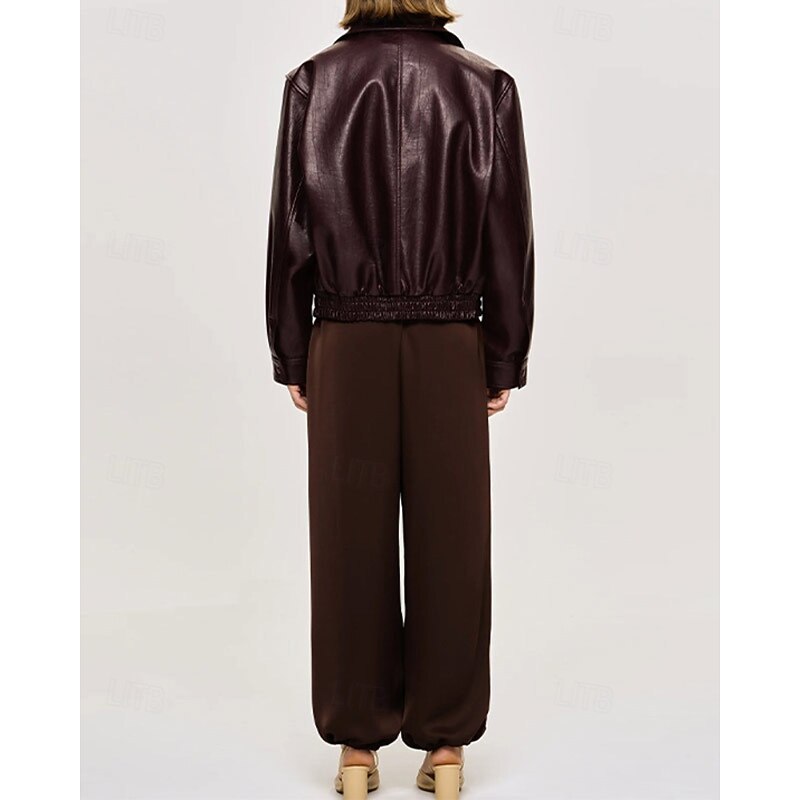 More information about Women's Faux Leather Jacket Comfortable Zipper Fashion Plain Holiday Weekend Zipper Regular Turndown Regular Fit Long Sleeve Outerwear Wine Fall Winter