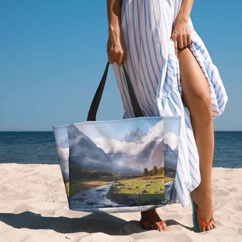 HOT ! (Travel Mountain Scenery) Large Beach Tote Bag For Women With Zipper Foldable Lightweight Travel Pool Bag For Vacation Shopping