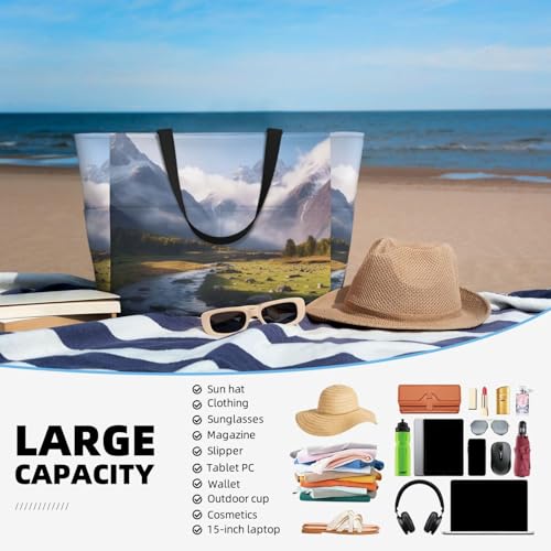 (Travel Mountain Scenery) Large Beach Tote Bag For Women With Zipper Foldable Lightweight Travel Pool Bag For Vacation Shopping 1
