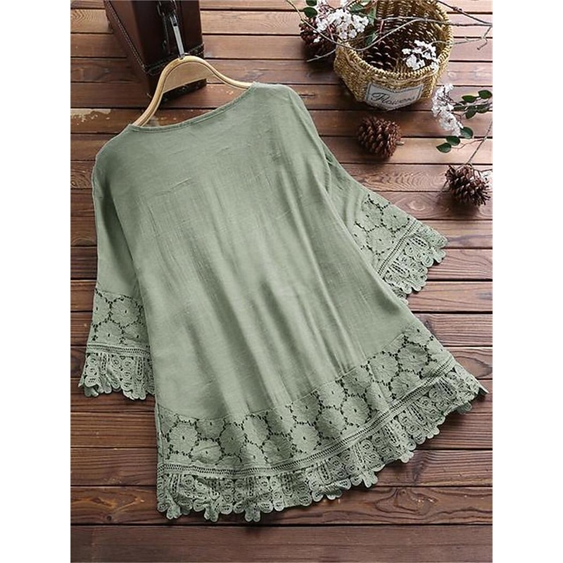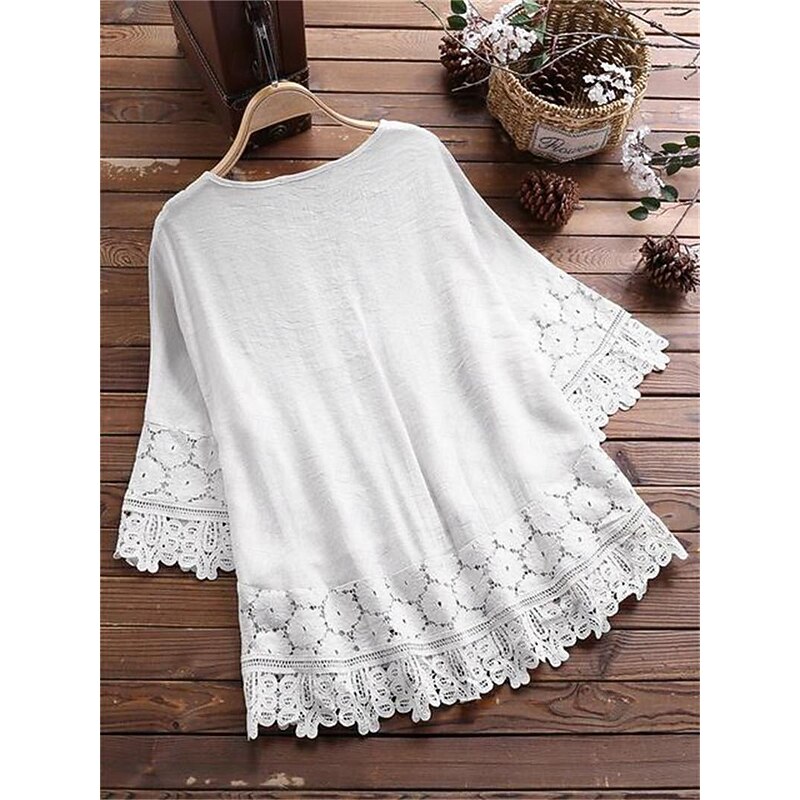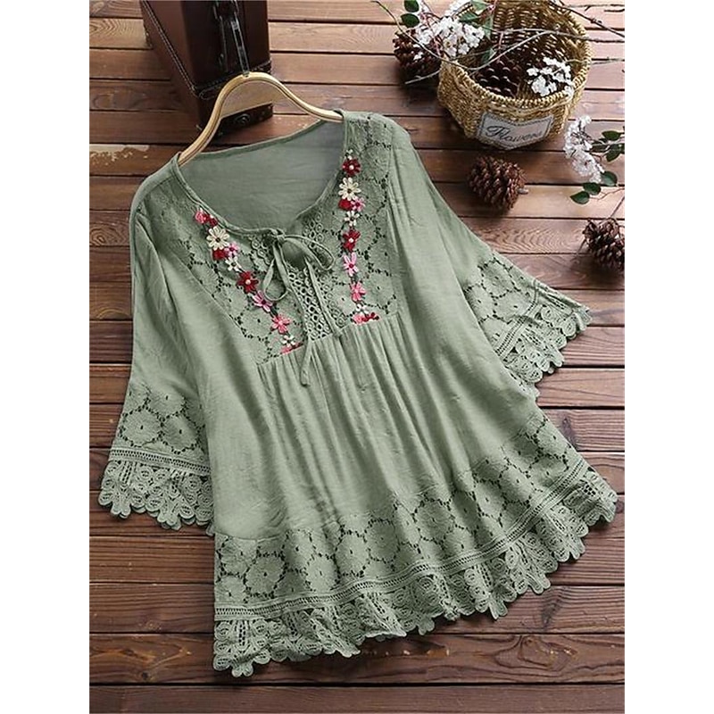 Highlights [Fabric]: Crafted from a lightweight linen cotton blend, this blouse offers comfort and breathability, making it ideal for warm summer days. The micro-elastic nature of the fabric ensures ease of movement and a relaxed fit. [Fit]: Featuring a loose and relaxed fit, this blouse is designed to provide both style and comfort. The standard thickness makes it perfect for casual daywear while maintaining a chic appearance. [Design Highlights]: This blouse showcases intricate lace-up details at the neckline and cuffs, complemented by delicate floral embroidery on the front. The three-quarter length sleeves and lace-adorned hemline enhance its feminine and timeless style, creating a cohesive and sophisticated look. [Occasions]: Versatile and stylish, this blouse is perfect for daily street wear, casual outings, and any occasion where comfort meets fashion. Pair it with accessories to effortlessly transition from a relaxed day out to a more polished evening look. [Size Notice]: Available in a wide range of sizes from S to 5XL, catering to different body shapes and preferences.