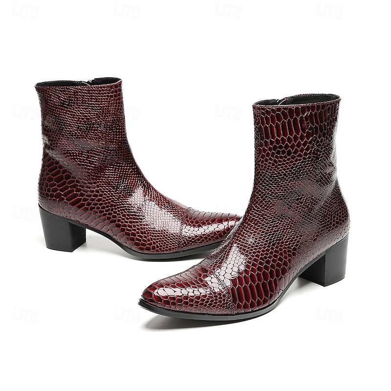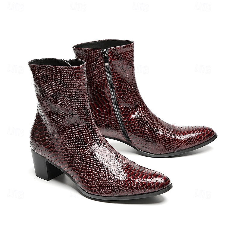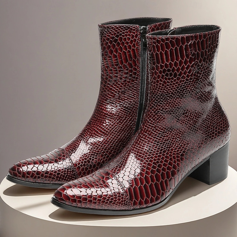 HOT ! Men's Genuine Leather Burgundy Crocodile Pattern Zipper Boots – Retro Ankle Boots for Business, Evening Parties and Special Occasions