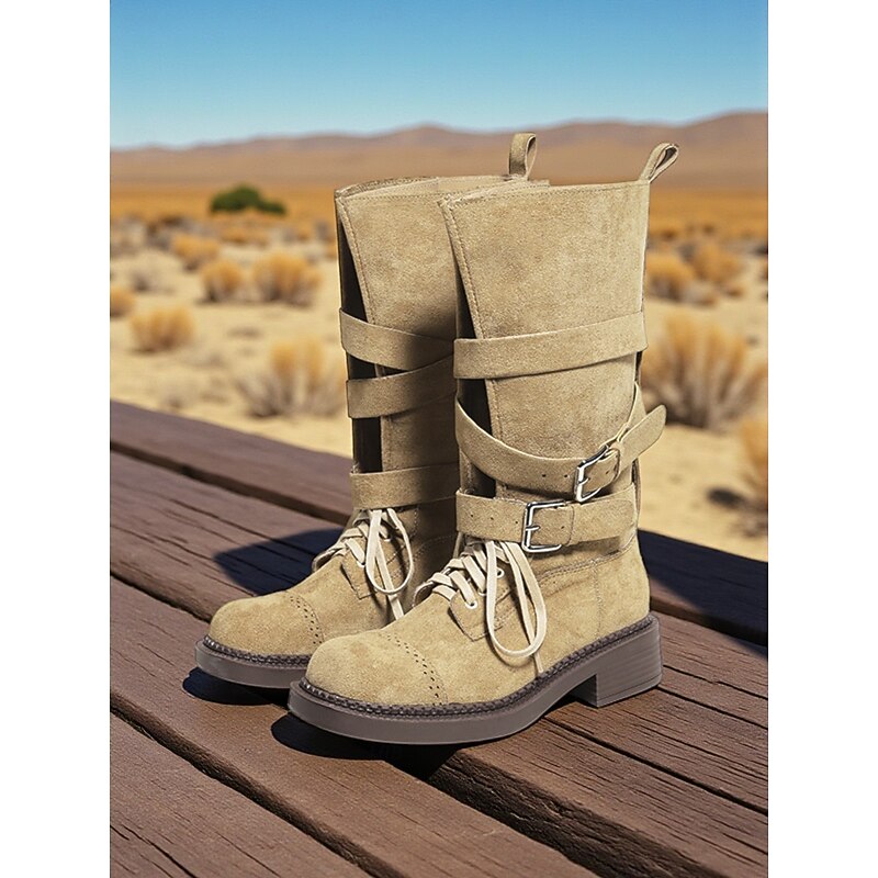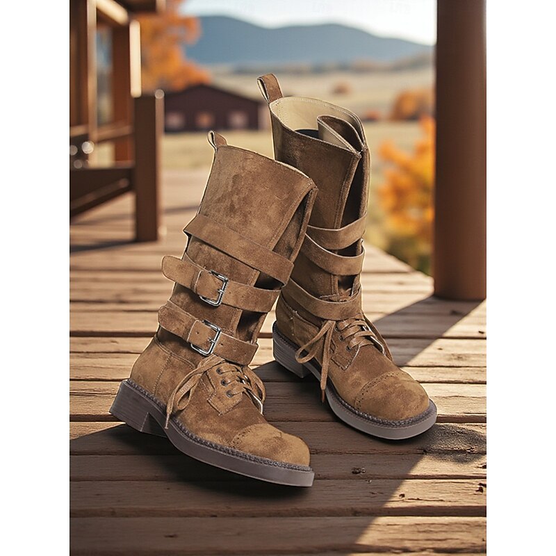 Women's Brown Suede Military Style Ankle Boots with Buckle Straps and Lace-Up Closure for Casual and Outdoor Activities 2