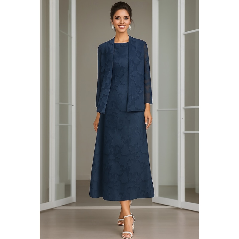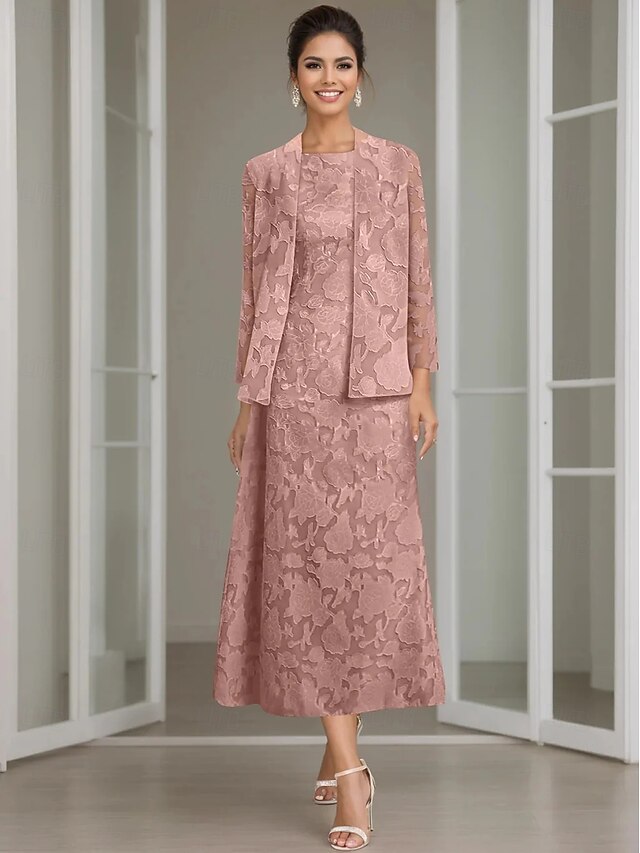 HOT ! Blue Pink Two Piece A-Line Dress Sets Mother of the Bride Dress Elegant Crew Neck Ankle Length Chiffon Lace Long Sleeve with Solid Color