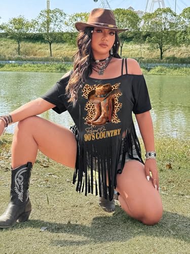 SOLY HUX Women's Plus Size Cold Shoulder Fringe Trim T Shirts Short Sleeve Graphic Tees Western Cowlgirl Outfits 4