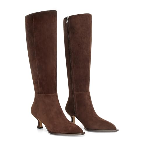 DOEYG Women Suede Knee High Boots Wide Calf Kitten Heel Boots Pointed Toe Stiletto High Heel Tall Boots Fashion Fall Long Boots with Side Zipper 1