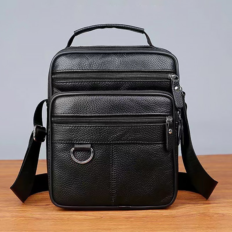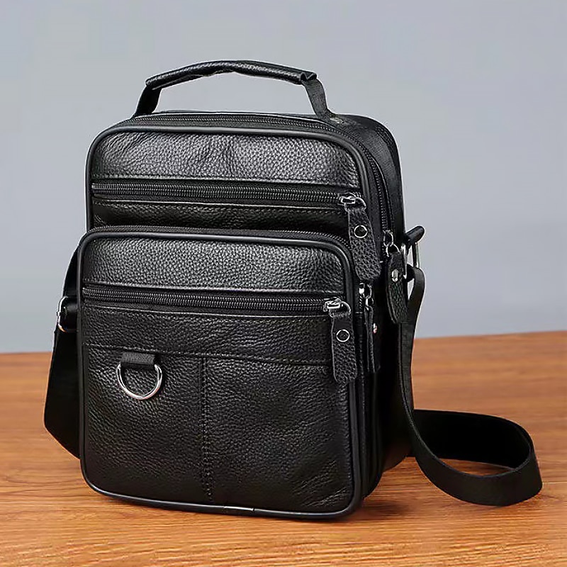 HOT ! Men's Black Leather Crossbody Messenger Bag – Multi-Pocket Shoulder Bag with Zipper Closure for Work, Travel & Daily Use
