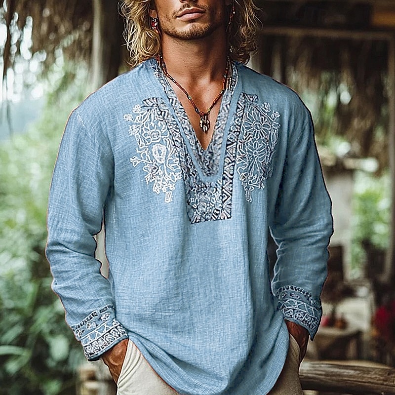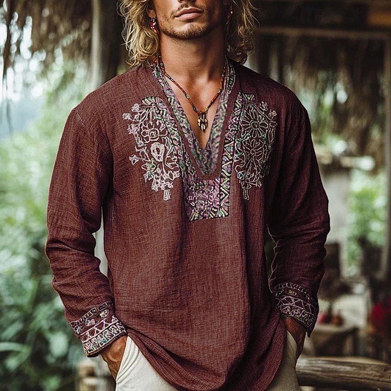 More information about Men's Popover Shirt Summer Shirt Beach Wear Vintage Shirt Ethnic Shirt Floral Vacation Holiday Yellow Blue Orange Brown Long Sleeve V Neck Summer Spring Clothing Apparel