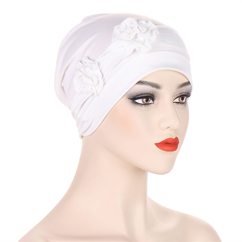 1pcs Beanie Hat Headwear Turban Covers Two Flower Head Wraps Turban Hat Classic Vintage Women Solid Color Soft Headgear