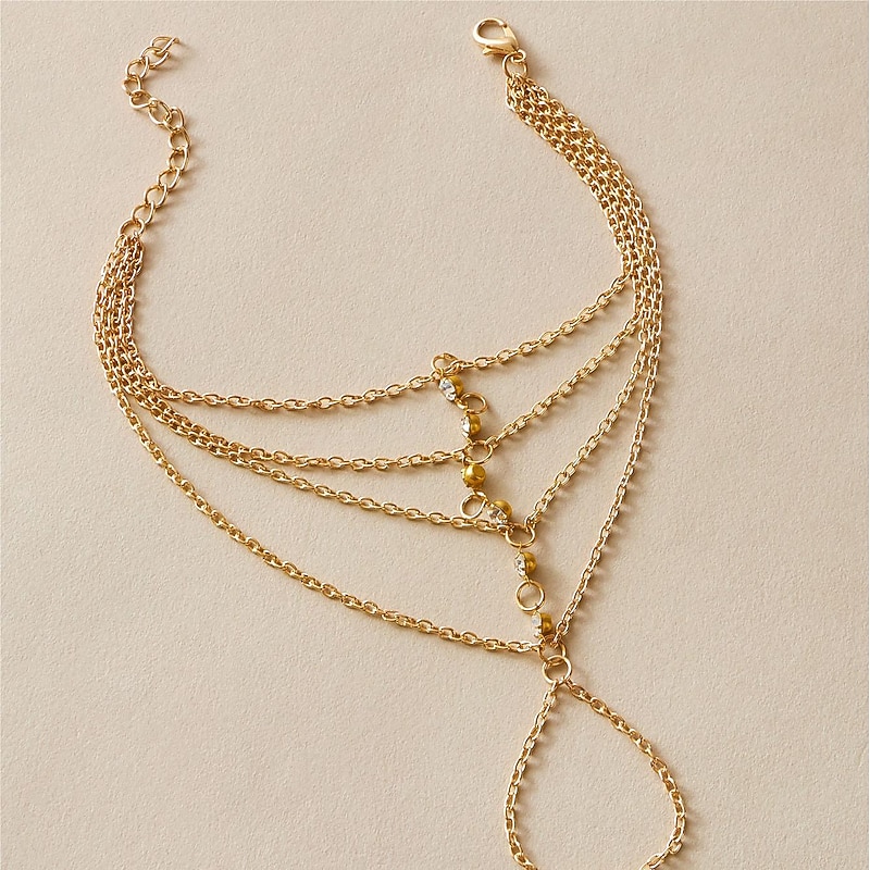 Highlights [Material & Craftsmanship] : Meticulously crafted from high-quality alloy, this bracelet features delicate gold metal chains that beautifully drape across the hand. The luxurious feel and shimmering embellishments add an elegant and contemporary look, perfect for any formal or festive occasion. [Design & Style] : The bracelet showcases a unique layered design with multiple thin chains that create a sophisticated, ladder-like effect. A primary chain fits snugly around the wrist, with additional chains elegantly cascading down towards the fingers, offering a modern and glamorous appearance. [Design Highlights] : The intricate design incorporates small, glistening embellishments that provide a touch of sparkle, making it a standout piece. Its lightweight construction not only ensures comfort but also delivers a refined and luxurious aesthetic, suitable for various events. [Occasions] : Ideal for weddings, birthdays, holidays, and festivals, this elegant bracelet is perfect for both formal and casual outings. Whether it's a special date or a festive celebration, this accessory adds charm and sophistication to any ensemble. [Size Information] : Designed for women, this bracelet is available in a size that fits comfortably, ensuring a perfect complement to any outfit while accentuating personal style.