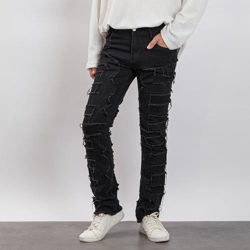 • Design: This stacked jeans for men features a raw edge design at the seams to prevent friction, durability, and stacked patches, giving it a unique look.Personalized denim pants, stacked denim jeans for men, mid-waist, zipper closure, front and back pockets, slim fit, personalized denim pants.