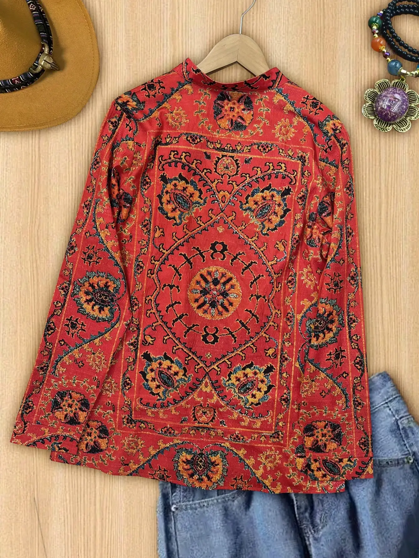 SPECIFICATIONSAge: SeniorBrand Name: NoEnName_NullCN: GuangdongChoice: yesClosure Type: Open StitchClothing Length: RegularCraft of Weaving: TatElasticity: Non StrechFabric Type: BlendedFit Type: Regular FitGender: WomenHign-concerned Chemical: NoneMaterial: POLYESTER,SpandexOrigin: Mainland ChinaPattern Type: FloralSeason: All SeasonStyle: CasualThickness: Standardsize_info: {sizeInfoList:[{length:{cm:98,inch:38.58},size:S,vid:100014064},{length:{cm:102,inch:40.16},size:M,vid:361386},{length:{cm:108,inch:42.52},size:L,vid:361385},{length:{cm:114,inch:44.88},size:XL,vid:100014065},{length:{cm:120,inch:47.24},size:XXL,vid:4182}]}whether full opening: YesRegular FitAchieve a balanced look with the regular fit design, designed to flatter a wide range of body types.Ethnic Style Geometric PrintInfuse a touch of ethnic flair into your wardrobe with this shirt's striking geometric print, perfect for making a statement.Casual StyleThis shirt's casual style makes it versatile for various occasions, from commuting to casual outings.Long Sleeve DesignStay comfortable throughout the seasons with the long sleeve design, offering both style and practicality.Polyester MaterialCrafted from high-quality polyester, this shirt ensures durability and a smooth, comfortable feel against the skin.