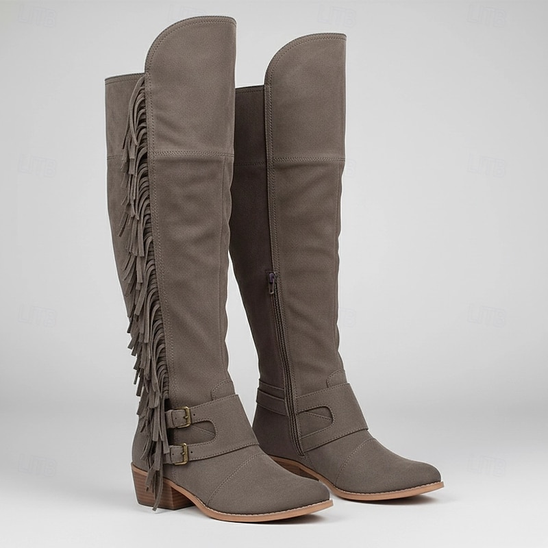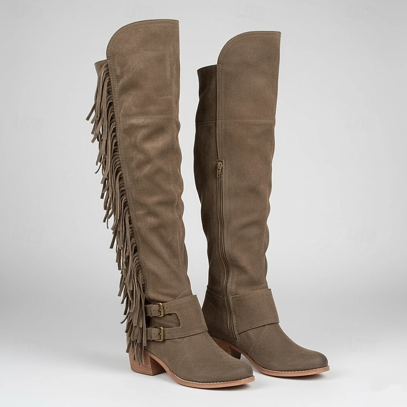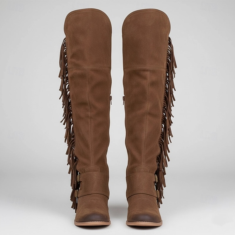 HOT ! Women's Brown Suede Fringe Knee-High Boots with Buckle Straps - Western Style for Festivals, Casual Outings, and Outdoor Adventures