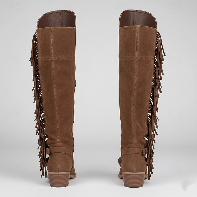 Women's Brown Suede Fringe Knee-High Boots with Buckle Straps - Western Style for Festivals, Casual Outings, and Outdoor Adventures 4
