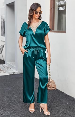 Ekouaer Silk Pajamas Set Womens Lace V Neck Loungewear Short Sleeve Satin Shirt with Long Pant Silky Pjs 2