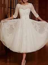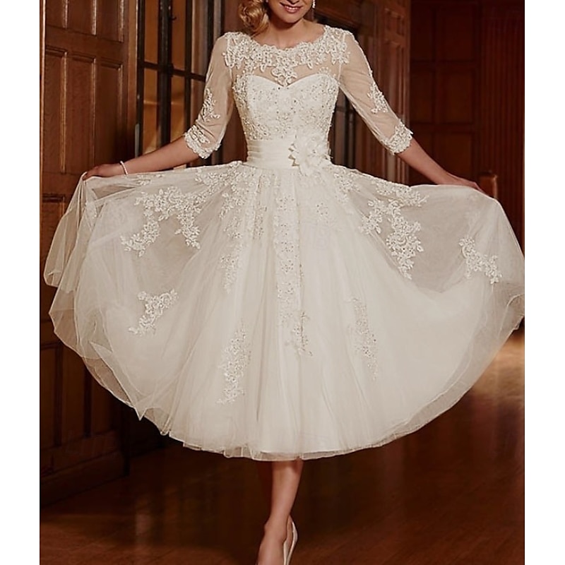More information about Reception Vintage 1940s / 1950s Little White Dress Bridal Shower Dresses Wedding Dresses A-Line Illusion Neck 3/4 Length Sleeve Tea Length Lace Bridal Gowns With Appliques