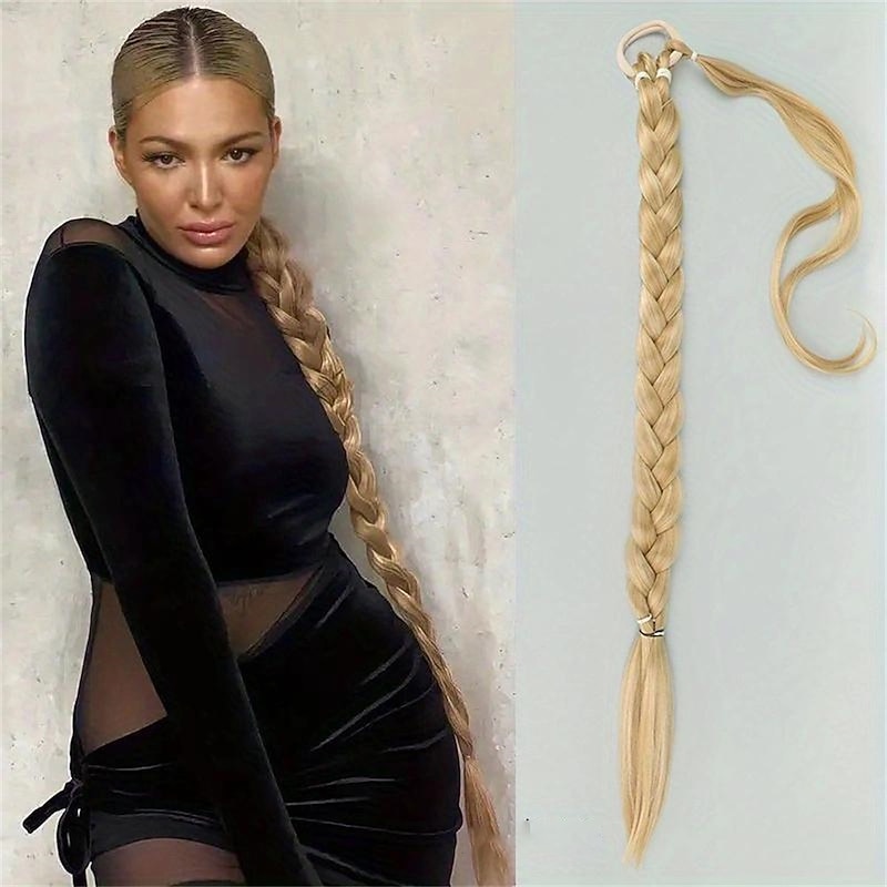 HOT ! Long Braided Ponytail Extension With Elastic Hair Tie Straight Sleek Wrap Around Braid Hair Extensions Ponytail, DIY Natural Soft Synthetic Hair Piece For Women Daily Wear