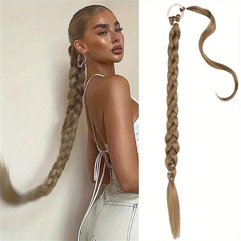Long Braided Ponytail Extension With Elastic Hair Tie Straight Sleek Wrap Around Braid Hair Extensions Ponytail, DIY Natural Soft Synthetic Hair Piece For Women Daily Wear 9