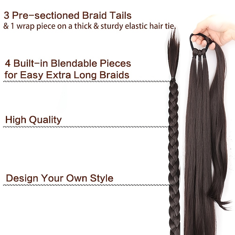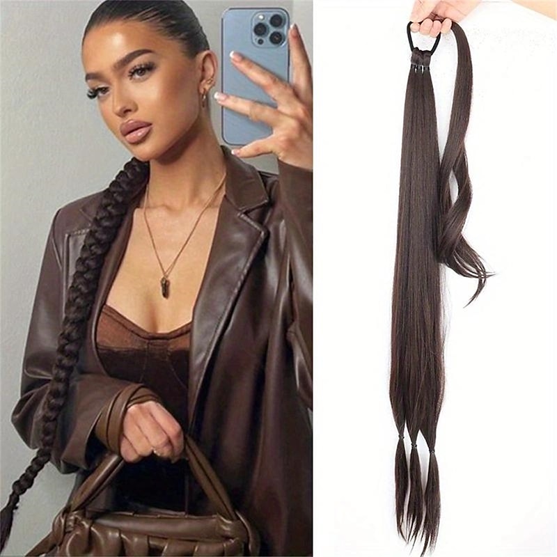 Long Braided Ponytail Extension With Elastic Hair Tie Straight Sleek Wrap Around Braid Hair Extensions Ponytail, DIY Natural Soft Synthetic Hair Piece For Women Daily Wear 2