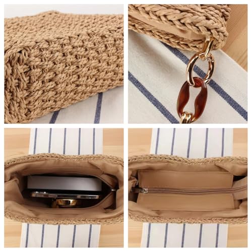 Women Woven Straw Shoulder Bag Summer Beach Chic Handbag with Acrylic Chain 6