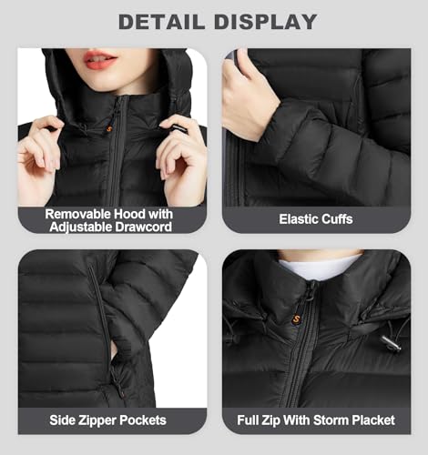 • Windproof Design: Featuring a removable hood with adjustable drawcord, full zip with storm placket, and elastic cuffs, this light down puffer coat effectively blocks out chilly winds and keeps you cozy throughout the day