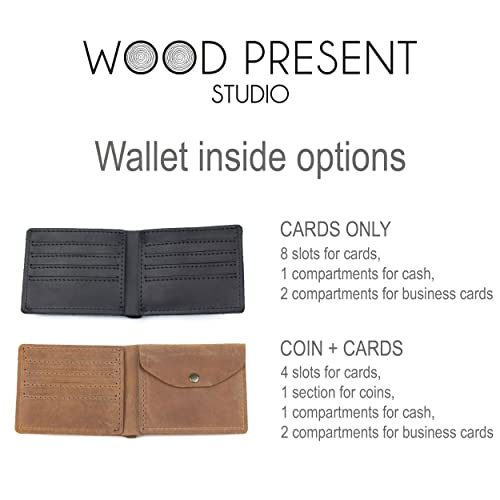 • CUSTOM: choose great custom leather wallet. 4 different colors available: whisky, walnut, brown, black. Wallet size (folded) 4,5” x 3.5” x 1/2” (11,5x9x1cm). You can choose packaging: carton box or engraved wooden box.