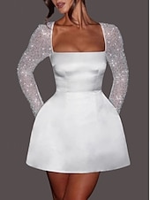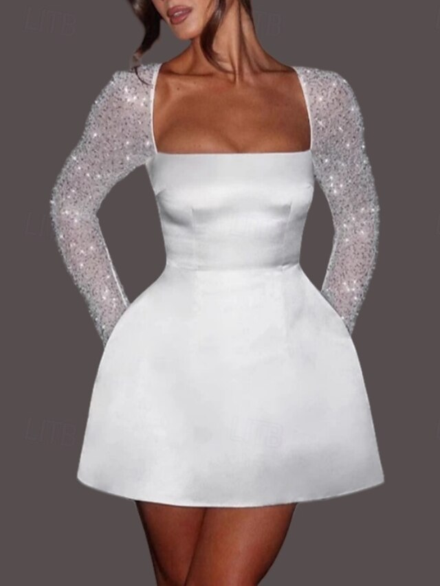 More information about Engagement Little White Dress Bridal Shower Dresses Wedding Dresses A-Line Square Neck Long Sleeve Short / Mini Satin Bridal Gowns With Pearls Pattern