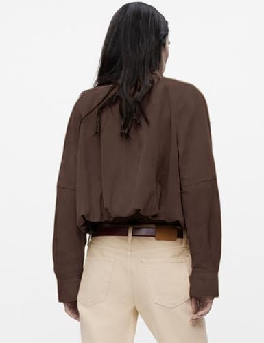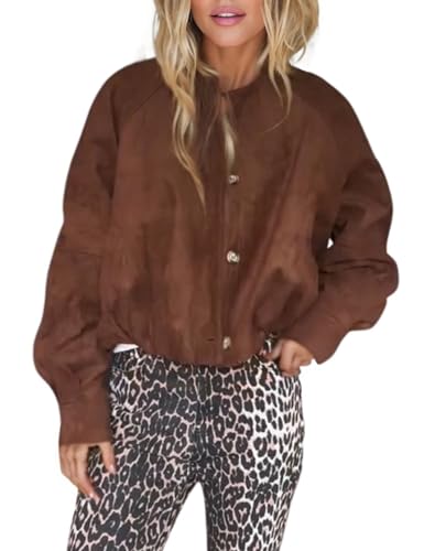 Women’s Cropped Faux Suede Jacket Crew Neck Button Down Outerwear Long Sleeve Oversized Bomber Jacket