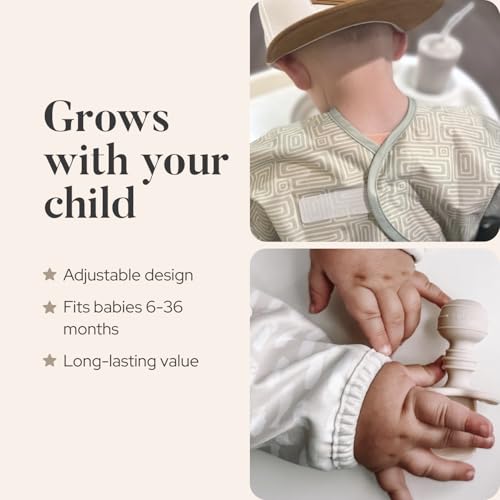 • superb FOR BABY-LED WEANING AND MESSY PLAY - Ideal for self-feeding infants and toddlers ages 6-36 months. The full arm and torso coverage protects clothing during messy mealtimes and has become a favorite for arts and crafts activities. Note: Sleeves may run slightly long for younger babies (6-12 months) - simply roll them up for a better fit.