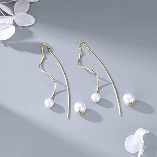 SLUYNZ Sterling Silver Pearls Dangle Earrings Curve Chain for Women Girls Pearls Threader Wedding Earrings for Brides