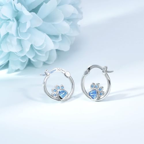 Paw Print Hoop Earrings for Teens Girls Women - Sterling Silver Small Cute Hoop Earrings Cubic Zirconia Hypoallergenic Cat Dog Paw Print Loop Earrings for Sensitive Ears Lovely Animal Earrings Gifts