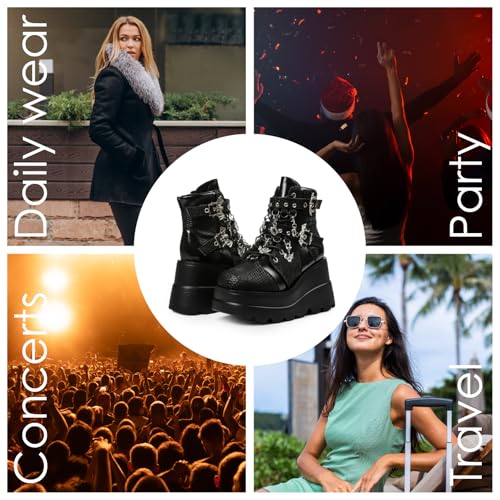 Tscoyuki Goth Platform Ankle Boots for Women - Bat Buckle Straps Rave Boots Zip Round Toe Combat Boots Womens Chunky Wedges High Heels Moto Booties