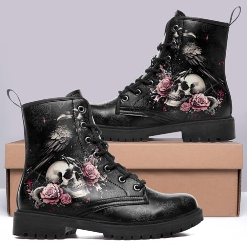 sought-after ! Womens Mens Gothic Combat Boots – Punk Rock Vegan Leather Ankle Booties Anti-Slip Skull & Roses Black Platform Work Boots