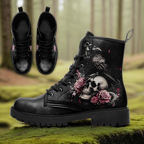 Womens Mens Gothic Combat Boots – Punk Rock Vegan Leather Ankle Booties Anti-Slip Skull & Roses Black Platform Work Boots 7