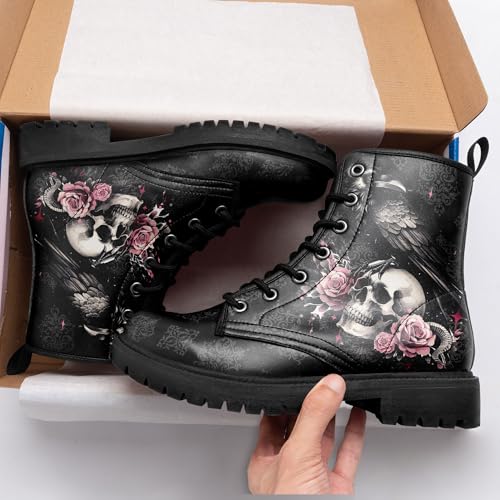 Womens Mens Gothic Combat Boots – Punk Rock Vegan Leather Ankle Booties Anti-Slip Skull & Roses Black Platform Work Boots 6