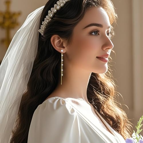 SLUYNZ Solid 925 Sterling Silver Simulated Shell Pearl Dangle Earrings for Women Teens - Elegant Long Chain Tassel Wedding Earrings