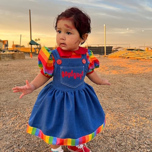 Fabric type: PolyesterCare instructions: Machine WashOrigin: ImportedHigh quality material: This baby girl costume is made of 100% recycled polyester, with a lightweight, soft, skin friendly and breathable texture, suitable for children's tender skin.Features: This toddler girl tops features doll collar, short sleeves, puff sleeves, and button details on the back, paired with a rainbow pattern, making it super fashionable.Design: This toddler girl suspender skirt features square neck, elastic waist, button-down shoulder straps, a front pocket, and ruffled hem design, paired with letter print and rainbow elements, making it super attractive.Perfect Gift: Toddler halloween costume girl, suitable as a holiday gift for girls on Halloween, Christmas, Easter, Thanksgiving, New Year, birthdays, and more.Package includes: 1 * tops + 1 * suspender skirt, little girl costume, perfect for Halloween parties, role-playing exhibitions, themed clubs, masquerade parties, costume parties, carnivals, Christmas, stages, and more. Perfect for everyday use. excellent materials and excellent craftsmanship ensure long-lasting durability.