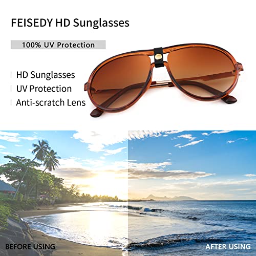 FEISEDY VINTAGE 70S DESIGN - This style shape looks great on every face shape.The simple and compact design makes our frames look very modern and exquisite. It is suitable for showing your unique and cool attitude towards life. Classic round pilot sunglasses design, this design is very popular among the public.top-grade MATERIALS - The frame is made of high-quality PC material and metal combination, comfortable to wear.Not easy to break. Both men and women are very suitable for this pair of sunglasses.UV400 PROTECTION SUNGLASSES - These pilot sunglasses can block 100% harmful UVA, UVB rays, protect your eyes against long term UV damage. High-Definition Lens Gives you a Natural & Clear Vision, and keeping your eyes healthy.PRODUCT DIMENSION: Lens Width: 61mm(2.40'') | Frame Width: 143mm(5.63'') | Frame Height: 55mm(2.17'') | Nose Bridge: 16mm(0.63'')| Temple Length: 145mm(5.71'').PERFECT ALL β These FEISEDY sunglasses are the perfect choice for outdoor activities such as driving, traveling, shopping, taking photosοΌ and are suitable as a high fashion accessory and daily wear all year round. Perfect for everyday use. High quality materials and excellent craftsmanship ensure long-lasting durability.