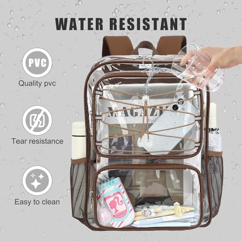Clear Backpack for Girls Women, Heavy Duty Transparent School Backpacks See Through PVC Bookbag for College Work Security Travel (Coffee)