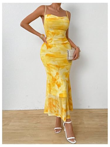 Milumia Women's Summer Floral Maxi Cami Dress Spaghetti Strap Mesh Cowl Neck Cocktail Party Bodycon Long Dresses