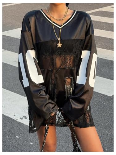 Women's Jersey Shirts Lace Sheer Number Print Oversized Tops See Through V Neck Sports Tee Tops Streetwear