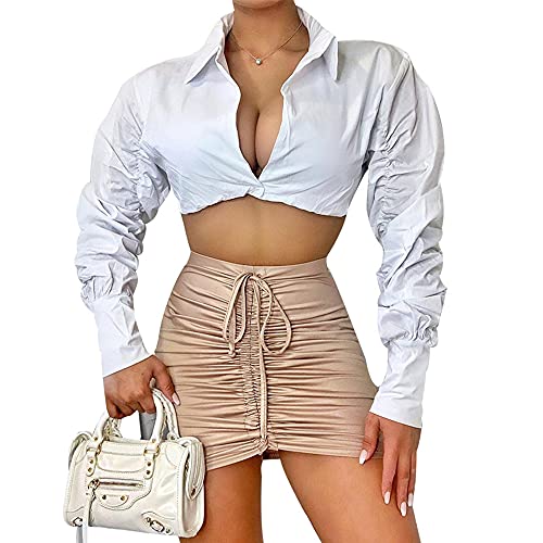 sought-after ! Azhong Women's Collared Puff Long Sleeve Deep V Neck Button Crop Top Blouse Shirt