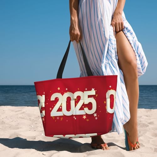 Happy New 2025 Year Print Beach Pool Bags Tote For Women Ladies Large Gym Tote Carry On Bag For Weekender Travel Waterproof 2
